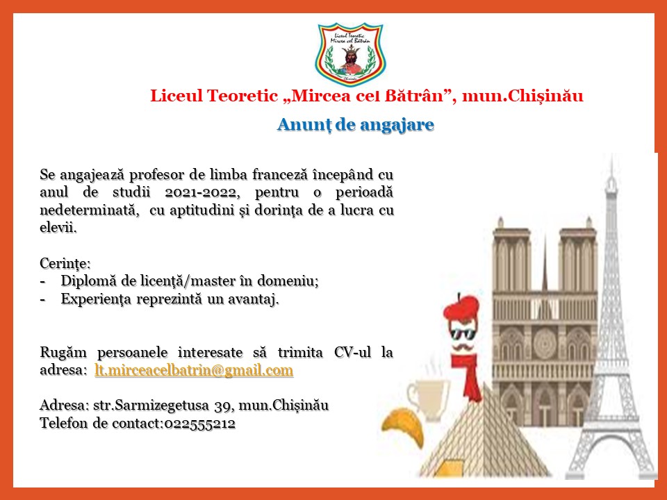 Anunț de angajare Se angajează profesor de limba franceză începând cu anul de studii 2021 – 2022 pe o perioadă nedeterminată.