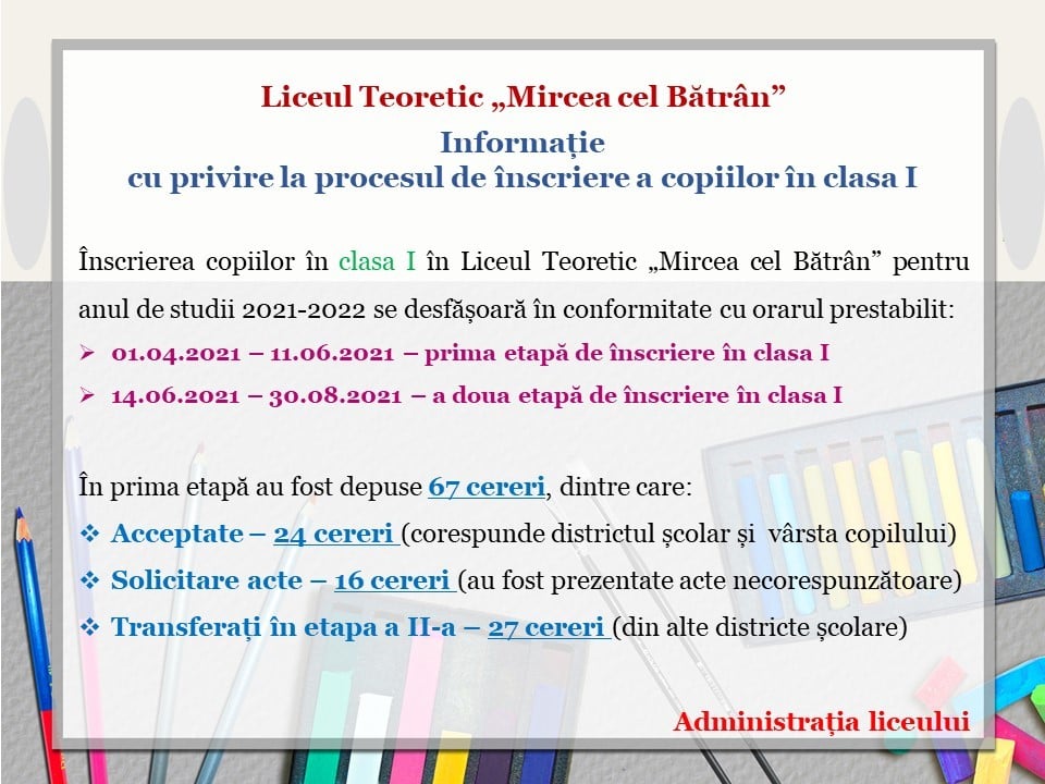 Informație cu privire la procesul de înscriere a copiilor în clasa I