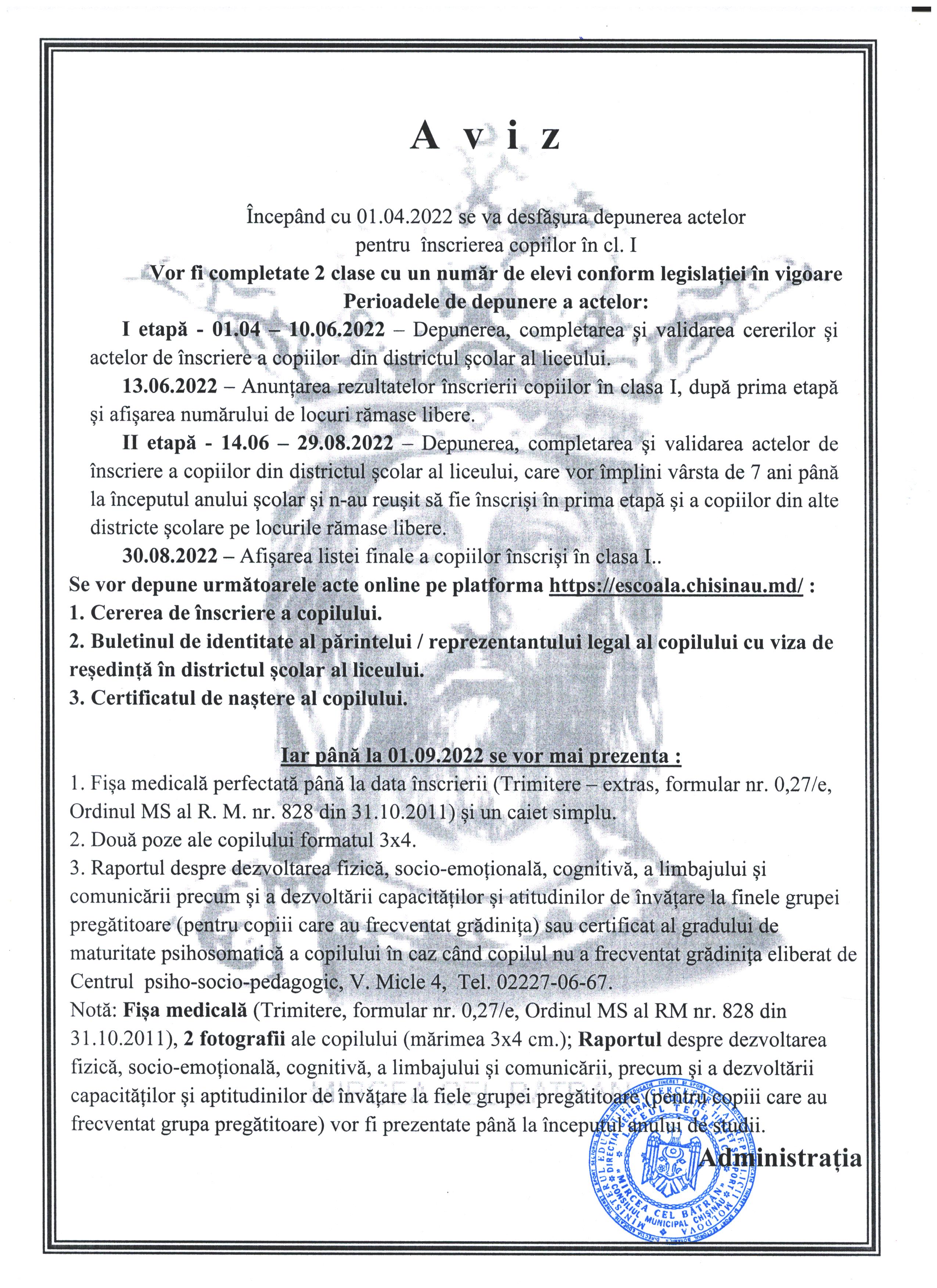 Aviz!!! Începând cu 01.04.2022 se va desfășura depunerea actelor pentru înscrierea copiilor în cl. I