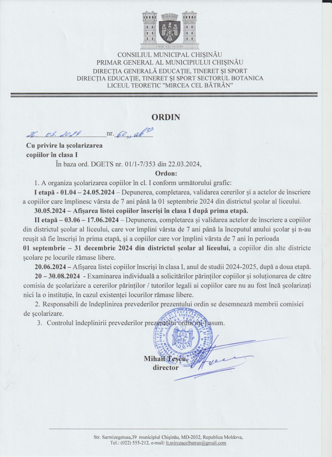 I etapă – 01.04 – 24.05.2024 – Depunerea, completarea, validarea cererilor și a actelor de înscriere a copiilor care împlinesc vârsta de 7 ani până la 01 septembrie 2024 din districtul școlar al liceului.